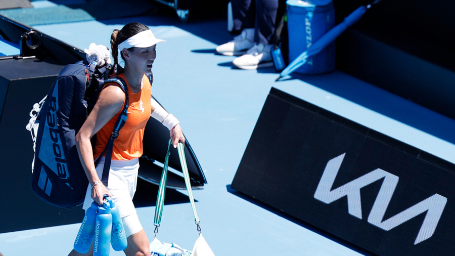 新华社照片,墨尔本(澳大利亚),2026年1月24日\n 1月24日,中国选手王欣瑜在对阵捷克选手诺斯科娃的比赛中,因高温比赛暂停离场 新华社记者 马平 摄