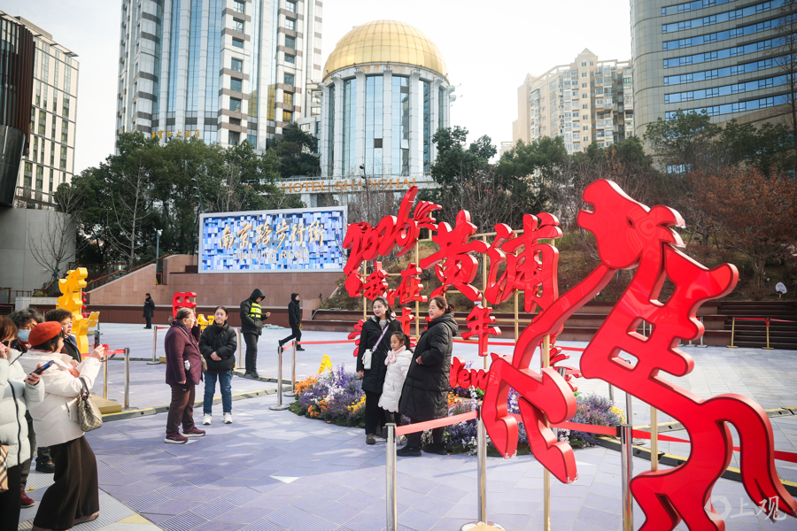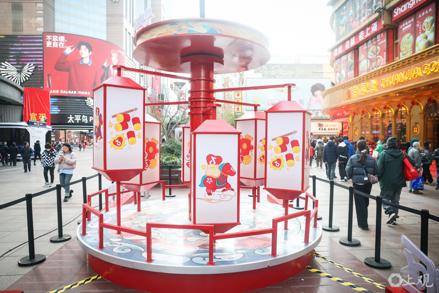 南京东路步行街上的世纪广场,展示新春美陈艺术装置。