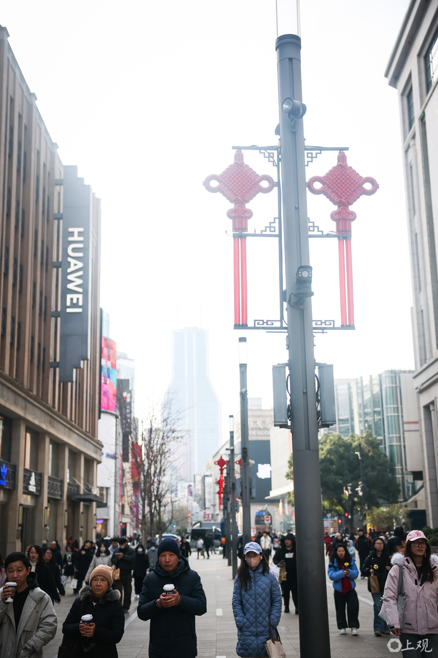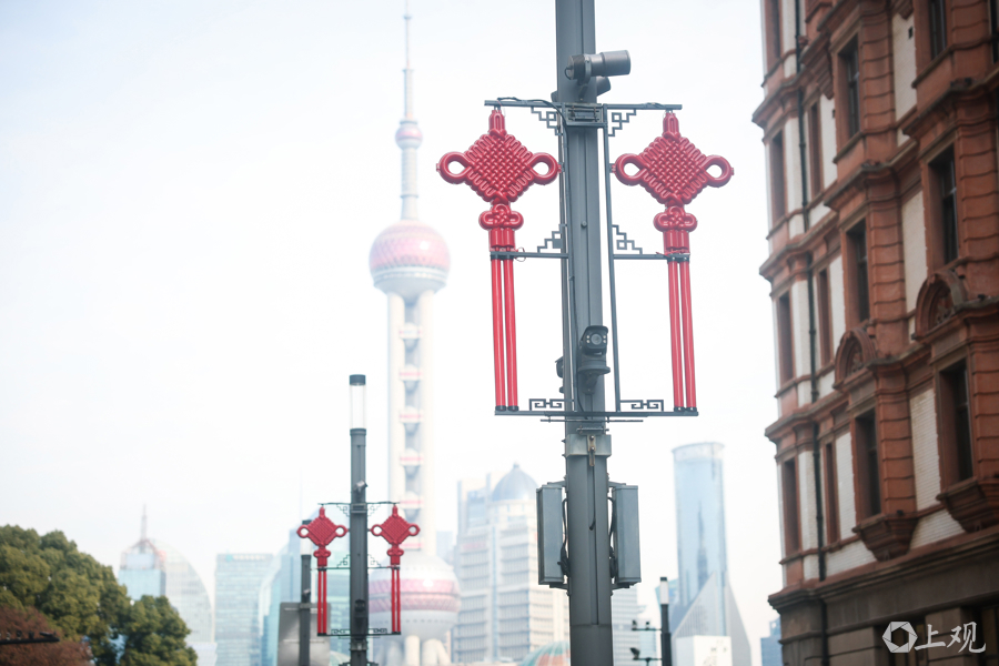 南京东路步行街东拓段,46只(23 组)“中国结”整齐地挂在电线杆上,为新春节日前的南京路和外滩装点出浓浓的新春氛围。