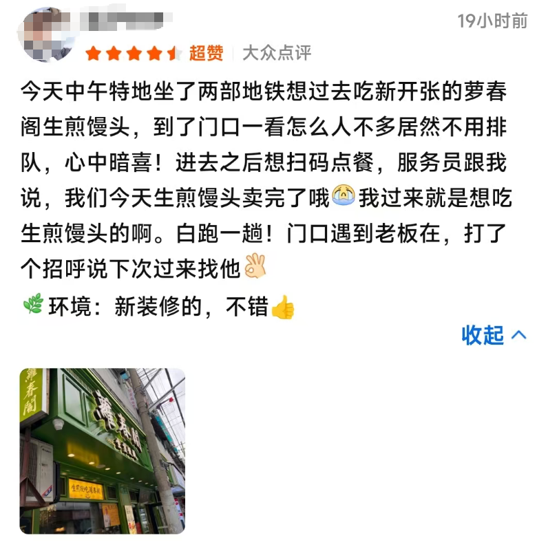 尽管开业首日存在备货不足、流程未臻完善等瑕疵,让部分专程而来的顾客未能如愿尝鲜,但萝春阁的回归依旧为上海的街头巷尾带回了久违的老味道与烟火气,这份意义早已超越了一份生煎本身。