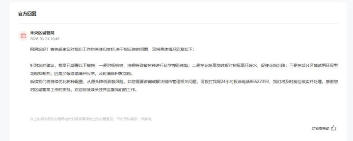 “针对您的提出,我局已部署以下步调:一是对杨柳树、法桐等致敏树种进行科学整形修剪;二是在花粉高发时段对树冠高压喷水,促使花粉千里降;三是在部分区域试用环保型花粉防止剂;四是加强绿地清扫保洁,实时废除集中花粉。”近日,西安市未央区城管局对网友留言进行了复兴,“后续咱们将握续优化树种成立,从起源裁汰致敏风险。”