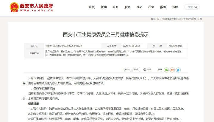 西安市卫生健康委员会提醒市民作念好花粉过敏防止。西安市东谈主民政府网站截图