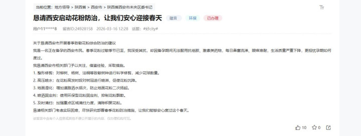 “但愿西安市有关部门大约尽快参议部署春季花粉防治步调,让咱们大约宽解渡过这个春天。”网友在留言中说。
