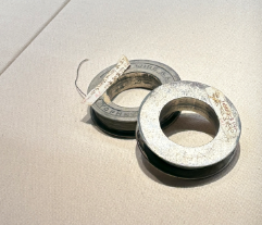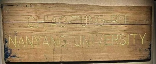 百年前交通大学的英文校名牌,校名牌为木质,中上部略有裂痕、缺边,笔墨为阴刻,笔迹明晰,所涂金粉仍齐备如初。
