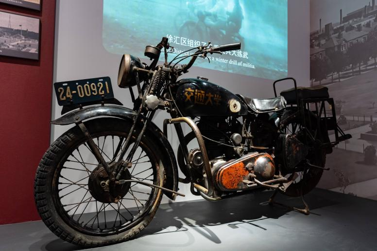 交通大学用于学生体育陶冶的入口摩托车(1950年代)。该车系英国原产的皇家恩菲尔德牌(ROYAL ENFIELD)摩托车。1955年,为增强学生身体,加强体育陶冶,交大团委诞生摩托车检察班,采购了40多辆世界列国的名牌摩托车,1956年暑假,这批摩托车随校西迁至西安。2026年交通大学建校130周年、西迁70周年之际,西安交通大学档案馆、博物馆将此摩托车捐馈送上海交通大学校史博物馆。