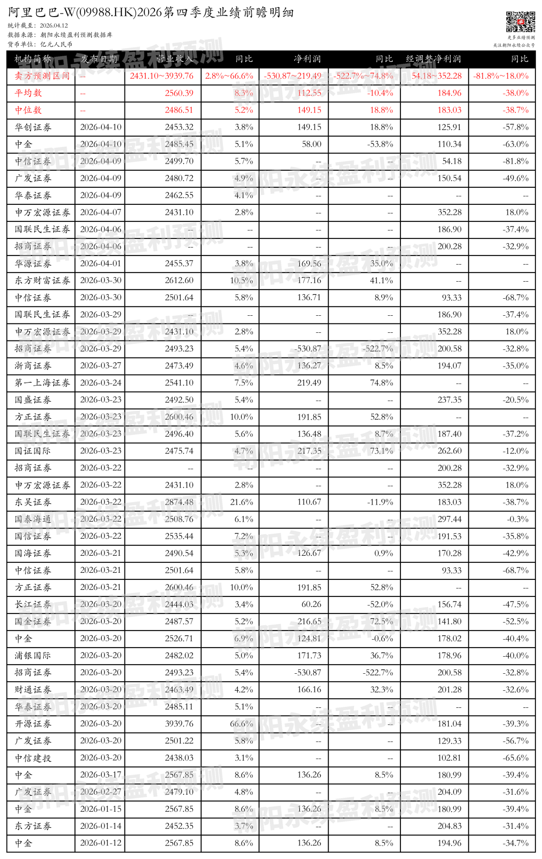 预测2026财年Q4营业收入2431.10~3939.76亿元,同比增长2.8%~66.6%;预测净利润-530.87~219.49亿元,同比变动-522.7%~74.8%;预测经调整净利润54.18~352.28亿元,同比变动-81.8%~18.0%。