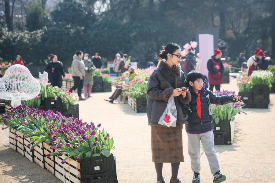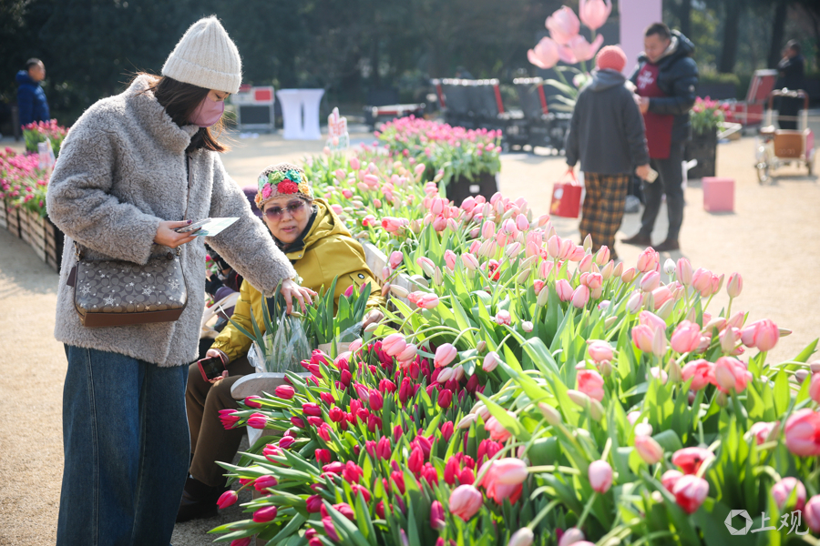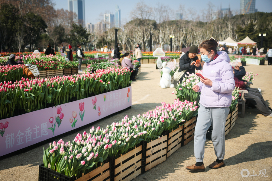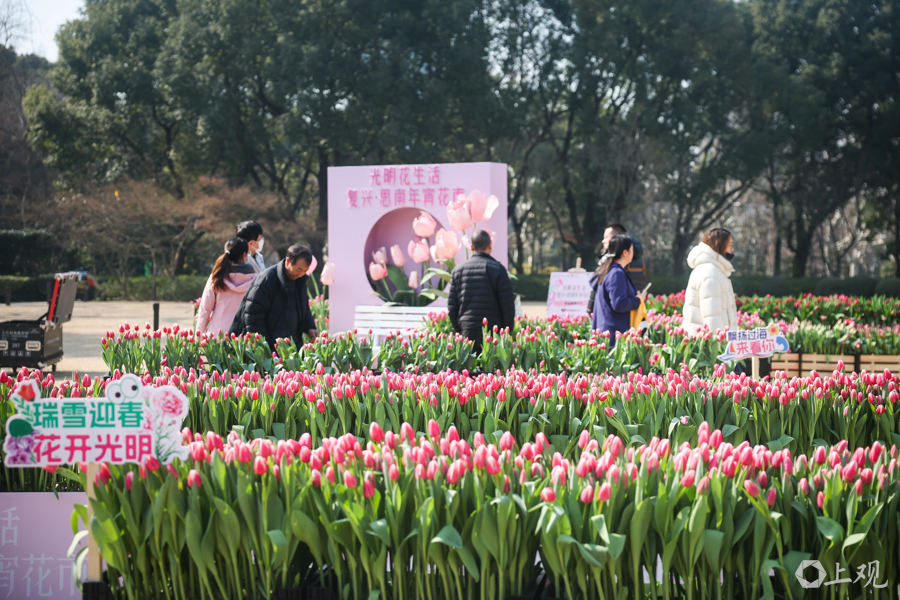复兴公园大草坪上,超过600平方米的水培郁金香汇成早春花海,粉、白、紫等色块交织成景。