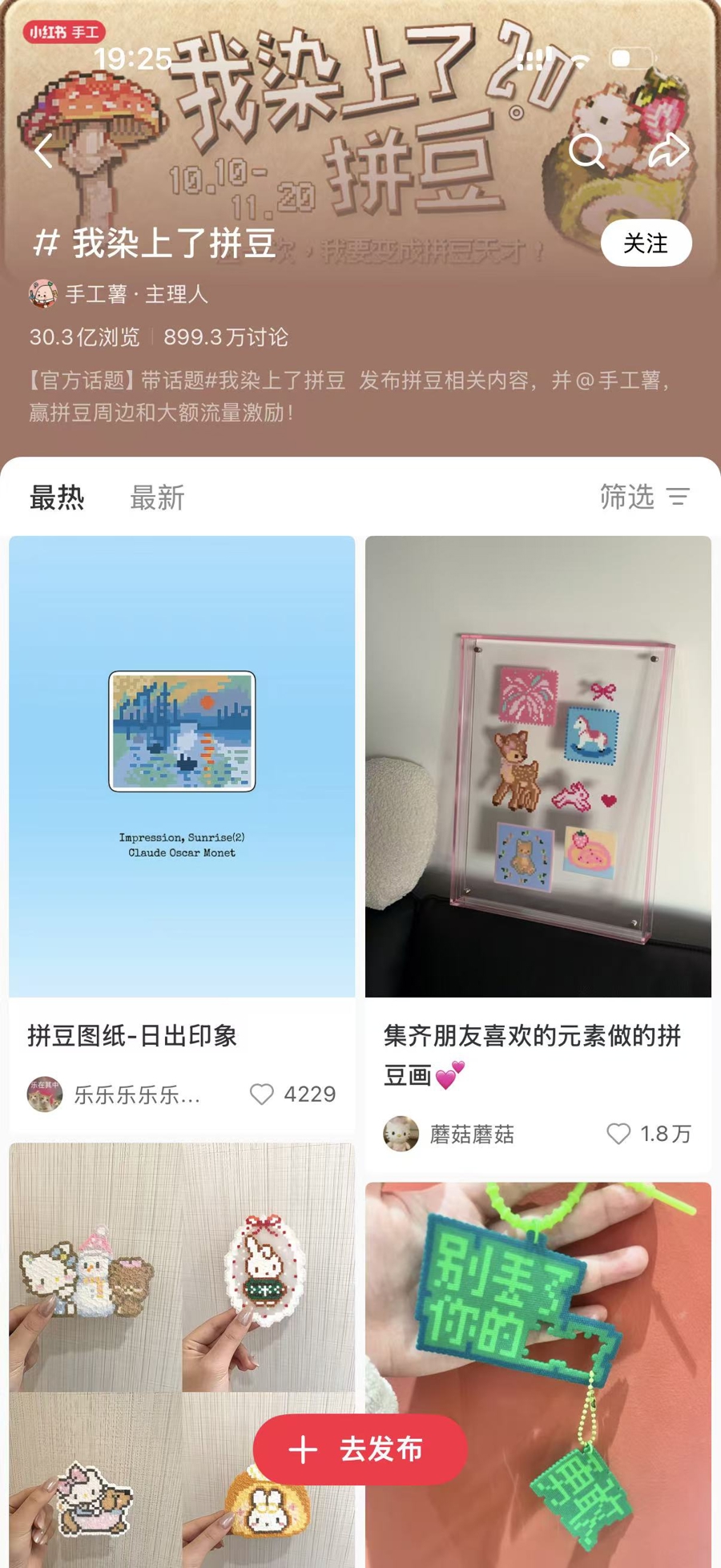 据淘宝官方数据,2025年十大商品中兼具高增长与情绪属性的品类表现突出,其中过去一年平台上“拼豆”搜索量同比上涨近500%。《小红书2025年度兴趣报告》也将拼豆列为十大出圈“奇怪”兴趣,其他还有谷子、手帐、手串、娃衣、钩织、BJD、胶片等。