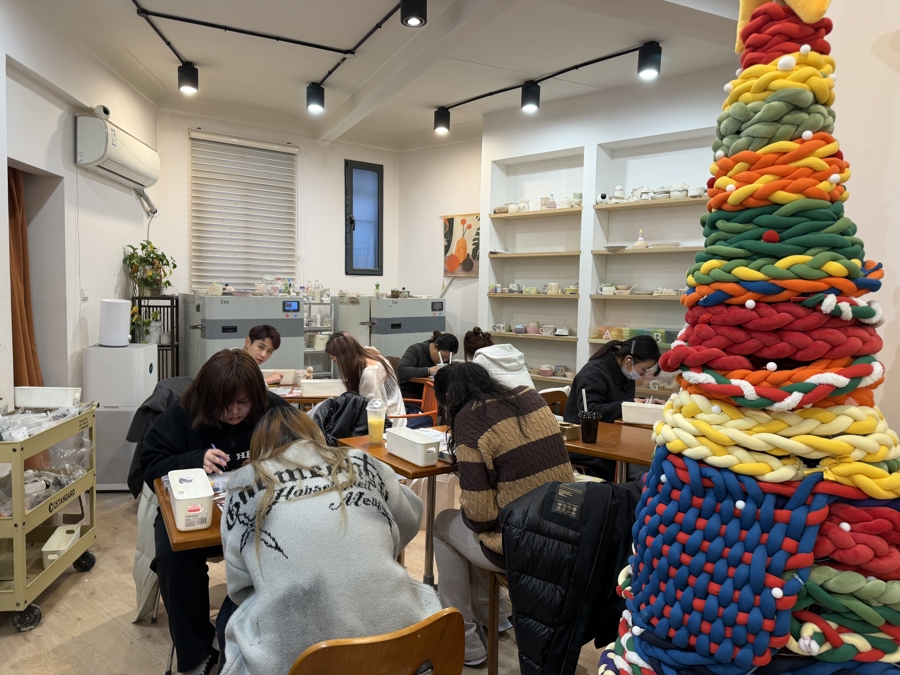 今年20岁的“一一”和“玉米狗”坐在靠近门口的位置。“一一”是山东人,在韩国留学,追星时认识了家在上海的“玉米狗”,趁寒假相约在上海游玩,两人把其中一项行程定在拼豆店。“我拼了两个喜欢的偶像,是根据他们在演唱会上的造型拼的像素小人。”“一一”翻出手机里的照片,将自己的拼豆摆在一旁,人物造型的拼豆用色多且杂,虽然整体不算大,但一件作品也耗费了她40分钟左右,“第一次玩拼豆觉得挺解压,也挺有乐趣,但长时间坐着,还要低头弯腰,累也是真的累”。坐在她对面的“玉米狗”今年高三,也计划未来去韩国留学,她正在专心致志地拼一款歌手周深的周边,打算送给妈妈作为礼物,“10年前我读小学的时候就玩过拼豆,最近又火了起来,突然被大家发现了”。