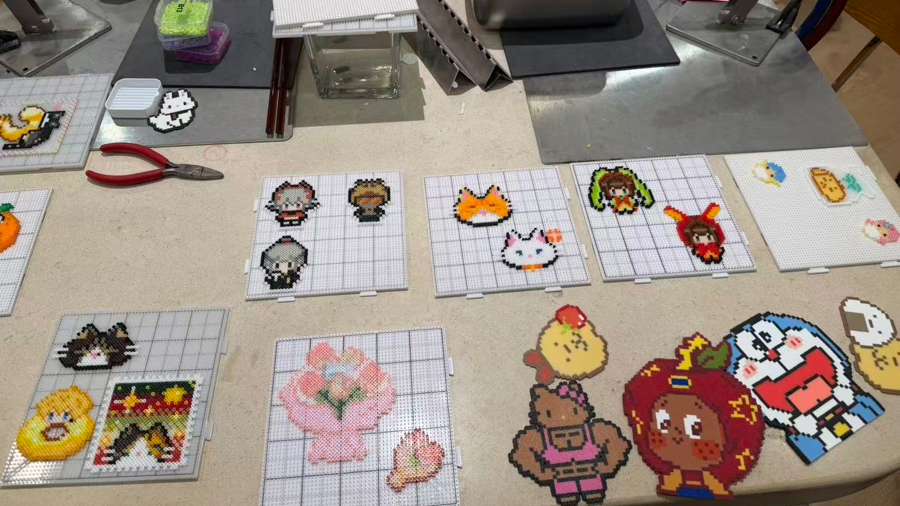 一整个下午,拼豆店大部分时候都像自习室,玩家们各自拿着镊子、面对着豆板,只闻频繁响起的门铃声和偶尔几句闺蜜、情侣间的窃窃私语。