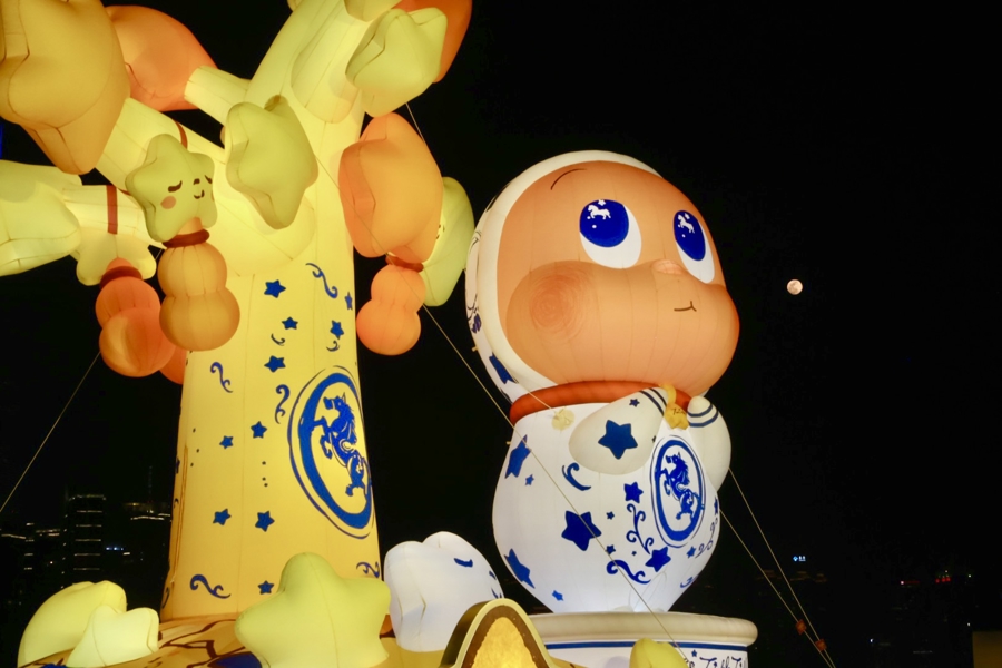 在BFC露台,星星人-星梦迎春装置温馨点亮。作为点金奔腾系列的形象,该形象灯组以青花瓷为创作灵感,铺展开一幅诗意的新春画卷。星星人化身为瓷上灵动祥纹,或嬉戏星间,或伴马共舞,以青花笔触勾勒美好期许,借熠熠星光传递真挚祝愿。