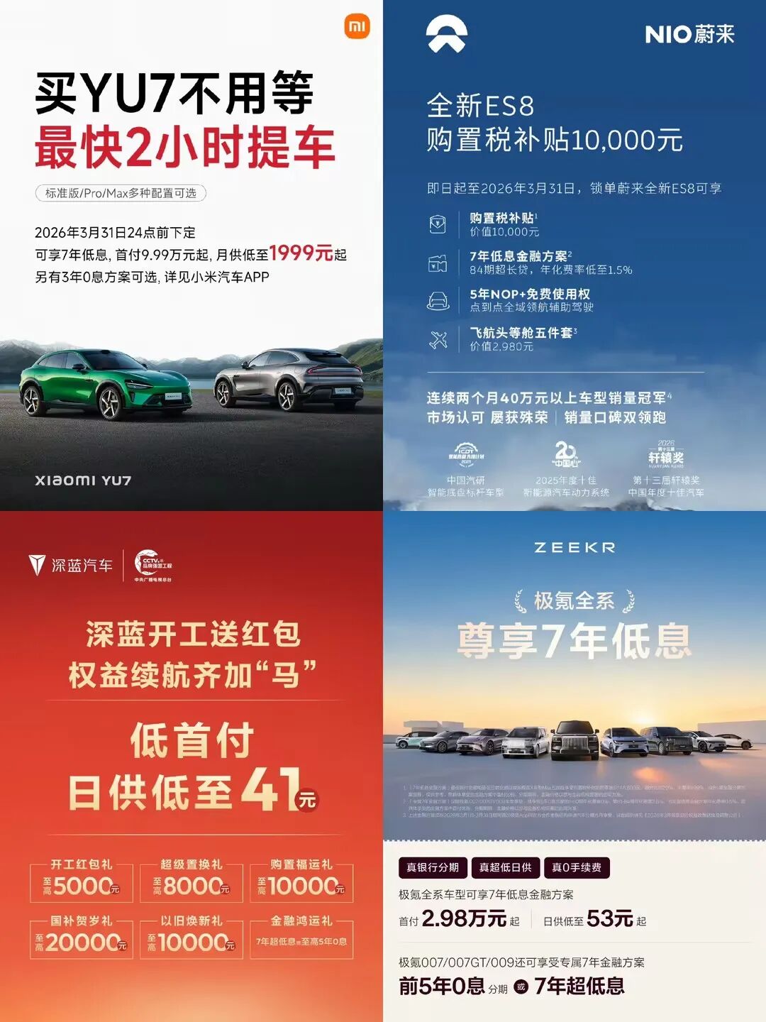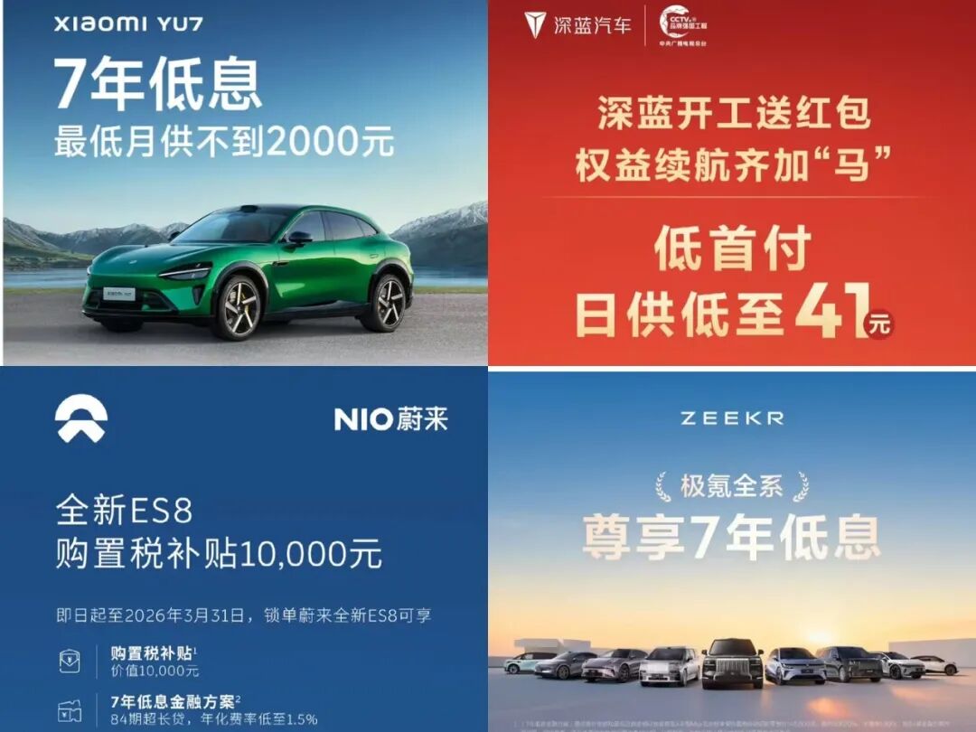 智己汽车推出“7年0首付3年0息”金融决议,新年现款红包至高2.3万元;零跑推出3月购车策略,全系车型概括职权至高4.6万元;深蓝推出“7年贷超低息”和“5年贷前3年0息”决议,以及开工购车福利至圣洁3万元;小米则针对具体车型推出具体职权,购买YU7可享“7年低息”,另有“3年0息”可选,最高享6.3万元的购车优惠,购买SU7 Ultra可享4.9万元的购车职权;蔚来品牌针对全新ES8提供购置税补贴1万元,针对新ET5、ET5T、ES6和EC6推出“7年超低息”购车决议,乐说念品牌加推购置税全兜底,全系至高补贴10262元。