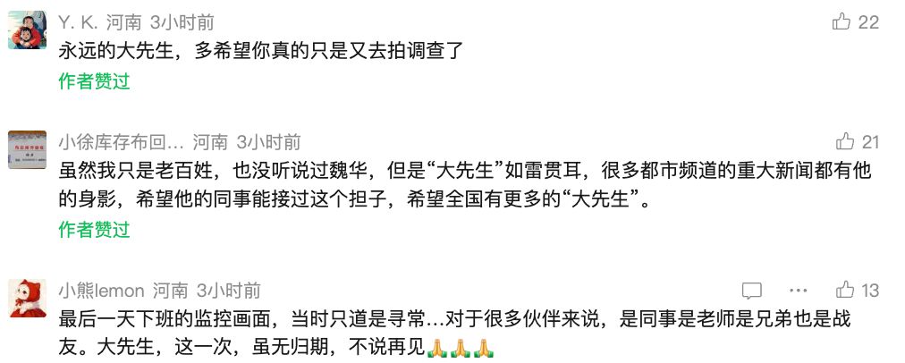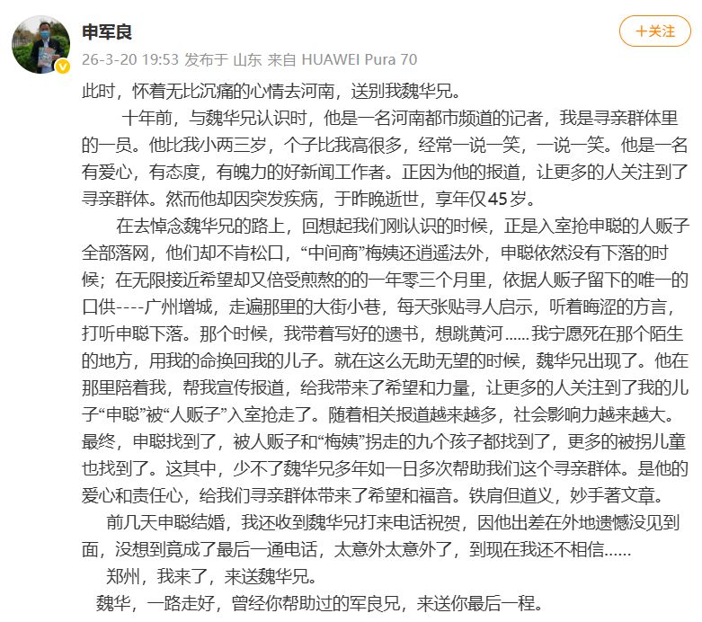 而在3月20日,被“梅姨”拐卖的儿童申聪的父亲申军良,发布了一个缅怀的音尘:十年前,曾在他四处寻子无望无助的时刻,帮他宣传报谈,给以他但愿和力量的河南播送电视台齐市频谈记者魏华,于3月19昼夜深,因突发腹黑疾病灾祸厌世,年仅45岁。