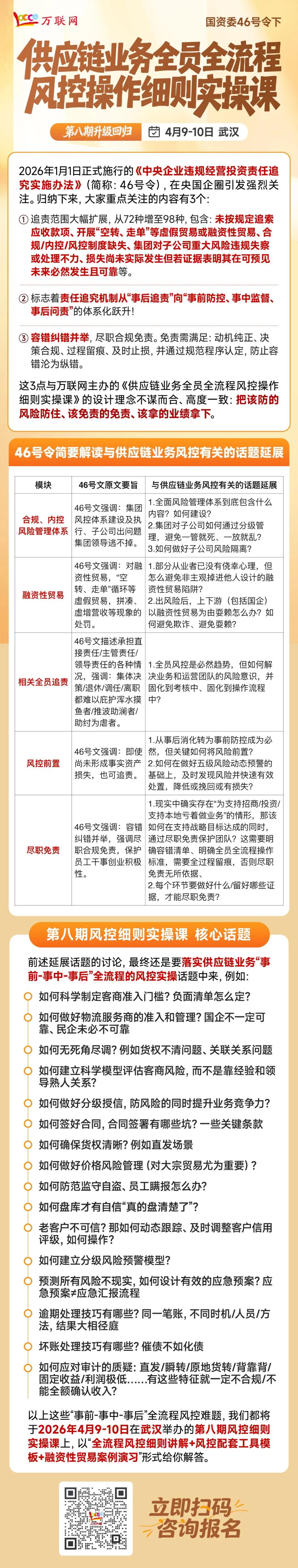 到了第八期,课程内容迎来了重磅迭代。咱们深度会通了群众尤为眷注的“46敕令”中的合规红线与风险点,不仅提供全进程风控笃定的深度教诲和配套用具模板,更畸形确立了融资性贸易案例演习要领。万联网首席风险管理实战内行张憨厚、万联网首席供应链业务法律风控内行张憨厚,两位资深导师将把“46敕令”揉碎了、讲透了。非论你是想搞懂新规界限,如故想建立一套粉饰“预先-事中-过后”全进程、全员参与的供应链业务风控操作笃定范例,这堂课都能帮你少走弯路、少踩坑。