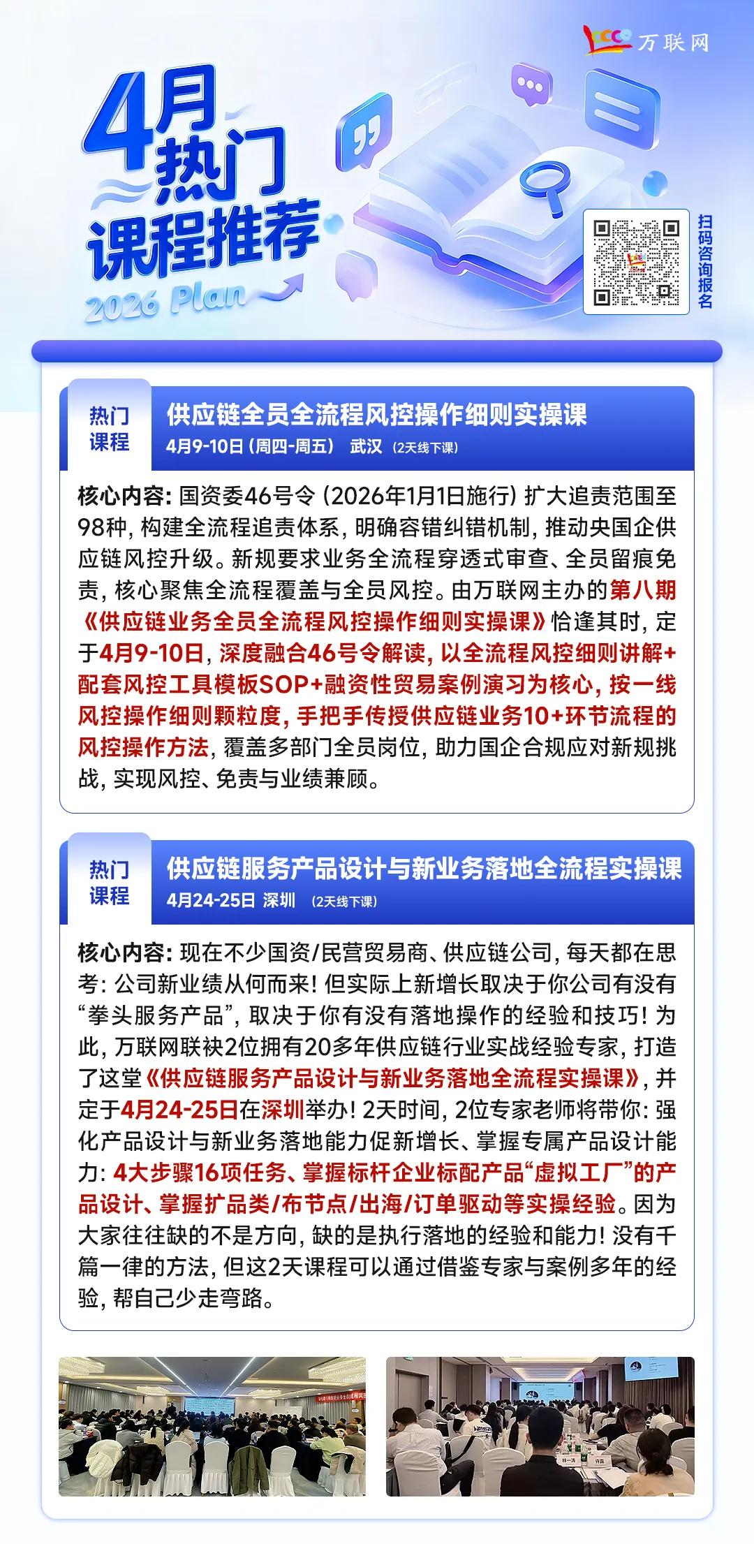 为助力国企贸易公司愈加合规、低风险地完成营收、拓展利润,2026年4月9-10日,万联网谋略在武汉举办第八期《供应链业务全员全进程风控操作笃定实操课》。这个系列课程目下已开班七期,累计眩惑了700多位来自近300家大型国企集团的高管组团报名,拍案叫绝。
