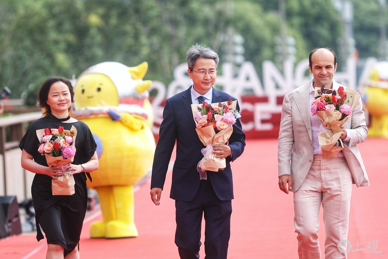 徐东莲(左)与中外共事走上“科学红毯秀”。赖鑫琳 摄