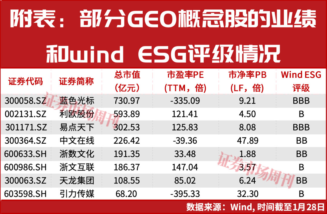 值得指出的是,近年多部门推动ESG机制建设,ESG报告逐步覆盖A股特别是重要指数公司和国有企业,但就GEO概念股来看,有不少公司尚未发布ESG报告。比如天龙集团2024年度并没有发布ESG可持续发展报告,而作为浙江地方国企的浙文互联同样也未发布2024年度ESG报告。Wind显示,浙文互联是中证1000指数成分股,也进入了陆港通名单。